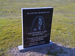 | Datoteka:Clifford Burton Memorial Stone At Crash Site.jpg Spomen obilježje za Cliffa Burtona, blizu mjesta nesreće | |