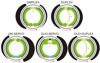 Dupleksne kočnice imaju dvije čeljusti s pomaknutim okretnim točkama (svornjacima). Pri kretanju kočnog bubnja ulijevo djeluju čeljusti automatski pojačano na tlačnu silu, a pri obratnom smjeru automatski oslabljeno. Ako su za oba smjera vrtnje sile kočenja jednake, moment kočenja je različit.