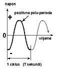 Napon na faznom vodiču ne mijenja se skokovito iz negativnog u pozitivni, nego po krivulji prema desnoj slici, koja se zove sinusoida. Napon od najnižeg negativnog napona prema zemlji postepeno raste i u jednom času ima vrijednost 0 (nula) a zatim dalje raste do maksimalne pozitivne vrijednosti. Iza toga počinje padati. Padajući opet prolazi kroz nulu, te dosiže najniži negativni napon. Time je zatvoren jedan puni ciklus promjene polariteta. Vrijeme potrebno za ovaj puni ciklus zove se period i bilježi se sa T. Frekvencija struje kazuje koliko ciklusa ili perioda se izmjenjuje u jednoj sekundi, odnosno koliko puta u sekundi izvor poprima pozitivni potencijal. Bilježi se sa slovom f, a iskazuje se u hercima (Hz). 1 Hz označava jednu pojavu svakog smjera u sekundi. U Europskim gradskim električnim mrežama struja ponavlja svaki smjer 50 puta u sekundi, odnosno koristi se izmjenični napon od 50 Hz. (U Americi se koristi gradska mreža sa frekvencijom od 60 Hz).