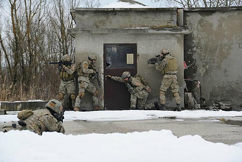 [[Datoteka:CRAirsoft.jpg|350px|mini|desno|Igrači iz Airsoft kluba Mantis se spremaju pretražiti prostoriju, simulacija se održavala u [[Trstenik (Marija Gorica)|Trsteniku]] tijekom zime.]] | |||