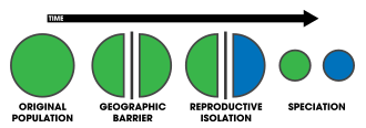 <!--'''Alopatrijska specijacija'''-->[[File:Allopatric Speciation Schematic.svg|right|thumb|300px|Populacija postaje odvojenom odvajanjem zemljopisnom barijerom. Razvija se [[reprodukcijska izolacija]] čiji ishod su dvije odvojene vrste.]] | <!--'''Alopatrijska specijacija'''-->[[File:Allopatric Speciation Schematic.svg|right|thumb|300px|Populacija postaje odvojenom odvajanjem zemljopisnom barijerom. Razvija se [[reprodukcijska izolacija]] čiji ishod su dvije odvojene vrste.]] | ||