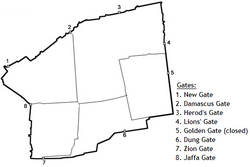 Grad je za vrijeme Križara imao samo četvera vrata na svakoj strani grada, Sulejman Veličanstveni je dao izgraditi današnje zidine i njegovih 11 vrata, nazvanih prema povijesnim osobama ili gradovima prema kojima su vodile ceste koje su izlazile iz Jeruzalema. Od ovih, sedmera su danas otvorena (Nova vrata, Damaščanska vrata, Herodova vrata, Lavlja vrata, Vrata Dunga, Vrata Ciona, Vrata Jaffe) dok su četvera zatvorena (Zlatna vrata, Jednostruka vrata, Dvostruka vrata i Vrata Huldah).