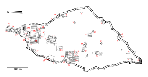 18.-21. Zapadna palača (18. Prostorije posluge, 19. Spavaonice, 20. Prodavaonice, 21. Poslovne zgrade), 22. Toranj za štavljenje, 23. Zapadna bizantska vrata, 24. Toranj, 25. Sinagoga, 26. Bizantska kapela, 27. Garnizonske prostorije,