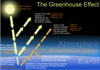 Temperaturu atmosfere može podići staklenički učinak. Taj učinak je posebno izražen na Veneri. Količina zračenja koja ulazi pod njezine oblake nije veća od količine koja ulazi u Zemljinu troposferu, jer iako je Sunce bliže, njezini oblaci odražavaju dvostruko više nego Zemljina atmosfera. Sunčevo zračenje, koje je najveće jakosti u vidljivom području svjetlosti, zagrijava tlo i pridnene slojeve atmosfere. Zagrijano tlo zrači, zrake odlaze u svemir i dolazi do hlađenja. Zemljino se tlo ohladi noću mnogo jače ako je vedro i ako nema mnogo vodene pare. No na Veneri postoji uvijek jednak pokrivač oblaka i guste atmosfere, pa infracrvene zrake koje zrači površina ne mogu izravno izaći u svemir. Molekule ugljikovog dioksida i, još učinkovitije, mala količina molekula vodene pare upijaju infracrveno zračenje. U cjelini, količina Sunčeve svjetlosne energije koja prodre u atmosferu jednaka je količini energije koju u svemir zrači Venerina atmosfera, no ta je ravnoteža postignuta pri velikoj toplinskoj zalihi atmosfere. Taj učinak zarobljenog zračenja pridonosi povišenju temperature i na Zemlji i na Marsu, ali mnogo manje nego na Veneri.[3]