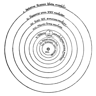 Nikola Kopernik je na samome kraju svoga života objavio djelo O vrtnji nebeskih krugova (lat. De revolutionibus orbium coelestium) u kojem zagovara heliocentrični model svemira, tj. onaj u kojem je Sunce, a ne Zemlja, postavljena u njegovo središte. Kopernik je promijenio i kalendar zbog pomicanja proljetne točke uslijed precesije (pomicanja Zemljine osi vrtnje). Također, utvrđuje postojanje trostrukoga gibanja Zemlje: njezinu rotaciju oko osi, revoluciju (gibanje Zemlje oko Sunca) i precesiju Zemljine osi. Ostali se planeti, smatra Kopernik, gibaju po kružnicama oko Sunca, a Mjesec ne smatra planetom. Iako je izbjegao progon i inkviziciju, jer mu je kapitalno djelo tiskano pred kraj života, njegovo je djelo raspirilo žestoke rasprave, sukobe i promjene. [8]