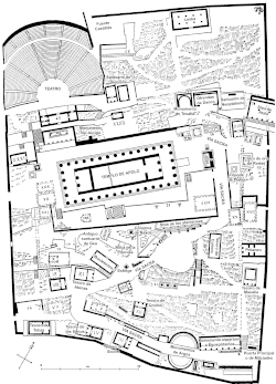 Najvažnija su tri dijela: Apolonov hram, Dionizijevo kazalište, te niz riznica i zavjetnih građevina. Bili su okruženi zidom koji je za njih predstavljao tzv. sveti krug. Nad svetim krugom bio je smješten stadion, dok je ispod svetog kruga bio gimnazium, tolos i riznice. Sport je u starih Grka bio važna djelatnost njezinih građana.