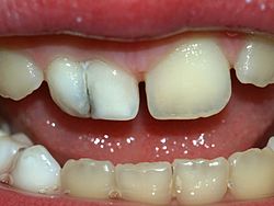 Istraživanja pokazuju da dodatak male količine fluora u vodu za piće, čini dječje zube dva puta otpornijim prema karijesu. Ipak, velike količine fluora mogu izazvati poremećaj koji se naziva fluoroza.[8]