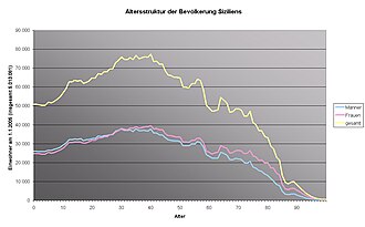 Prosječna očekivana životna dob je 73,2 godine za muškarce i 78 godina za žene<ref>{{ | Prosječna očekivana životna dob je 73,2 godine za muškarce i 78 godina za žene<ref>{{nje oznaka}} Daniela Schetar i Friedrich Köthe, ''Sizilien, Egadische, Pelagische & Liparische Inseln,'' Reise-Know-How-Verlag Peter Rump, Bielefeld 2005.</ref>. Oko 95 % stanovništva su [[Rimokatolička Crkva|rimokatolici]]<ref>{{nje oznaka}} Sizilien, Baedeker Allianz Reiseführer, Verlag Karl Baedeker, Ostfildern, 2005.</ref>. U blizini Palerma postoji nekoliko naselja s [[Albanci|albanskim]] ([[Arbëreshë]]) stanovništvom. Još jednu etničku skupinu čine sjevernoafrički muslimani, većinom iz [[Tunis]]a. | ||