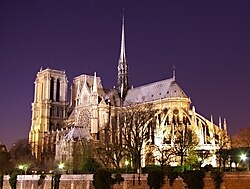 Prvim građevinama gotike smatraju se pariška crkva Saint Denis, koju je 1137. godine dao izgraditi opat Suger, a potom katedrala u Chartresu i katedrala Notre-Dame u Parizu. Nasuprot romaničkih širokih ploha, zbijenosti i masivnosti, gotička arhitektura teži visini, prozračnim formama i „nedokučivom interijeru” prepunom svjetla. Arhitektonski elementi poput rebrastog križnog svoda, prelomljenih lukova i snažnih kontrafora, naglašavaju visinu građevina. Kontrafori završavaju šiljastim tornjićima (fijale), s kovrčastim kamenim ukrasima (rakovice, pužarice) na rubovima. Na pročelju gotičkih katedrale nalaze se obično po dva visoka i šiljasta zvonika, kojima je naglašena dominacija vertikale u cijelom sustavu, a iznad sjecišta glavnoga broda s poprečnim uzdiže se tanki i vitki krovni tornjić[4]. Važnu ulogu u gotičkom prostoru imaju ukrasne galerije ili visoku prozori, koji ispunjavaju prostor crkve svjetlošću.