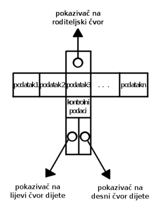 Čvor T-stabla obično se sastoji od pokazivača na roditeljski čvor, lijevi i desni čvor dijete, uređeno (sortirano) podatkovno računarstvo polje, pokazivača (na podatke) i nešto dodatnih, kontrolnih podataka. Dakle sami podatci zapisani su drugdje u memoriji, a T-stablo, odnosno podatkovno polje sadrži samo pokazivače na njih. Postoje tri vrste čvorova: Čvorovi sa dva podstabla zovu se unutarnji čvorovi, čvorovi sa samo jednim potstablom zovu se polulistovi, a oni bez podstabala zovu se listovi (engl. leaf node).