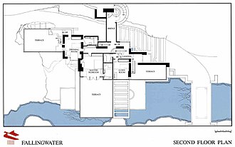 Fallingwater je pokušaj integracije kuće i krajolika, unutarnjeg i vanjskog prostora. Smještena je na šumovitom obronku, a njezina čvrsta jezgra okomito je usađena u gornji dio tog obronka da bi držala ravnotežu vodoravnim terasama koje poput krakova izlaze iznad slapa. Iako su vodoravni oblici svojom bež bojom u kontrastu s okomitim oblicima od kamena i šumskog okoliša, oni kao da „izrastaju” iz obronka[4]. Oba kata imaju staklene stijene zbog pogleda u prirodu, što je bilo vodiljom cijelog projekta. U prizemlju, izdignut na stupove nalazi se glavni dio dnevnog boravka s kuhinjom, blagovaonicom i terasama. Spavaonice na drugom katu otvaraju se prema terasama, dok galerija tvori manji gornji kat. Krovni prozori od stakla i betona natkrivaju jedan dio dnevnog boravka, dok viseće stubište vodi do vode[5].