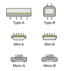 Konektori za USB su izvorno izvedeni u dvije osnovne inačice – A i B. Tip A najčešće se koristi na uređajima s kojih se podatci šalju prema računalu, kao što su miš, tipkovnica, digitalni foto-aparat itd. Konektor tipa B najčešće se koristi na uređajima na koje se podatci šalju s računala, poput pisača. Zbog potrebe za spajanjem uređaja koji teže smanjivanju dimenzija (npr. foto-aparati i mobiteli) kasnije su standardizirani konektori Mini-A i Mini-B dimenzija 6,8 x 3 mm, a još kasnije Micro-A i Micro-B dimenzija 6,85 x 1,8 mm. Uz smanjenje dimenzija dodan je još jedan pin za identifikaciju tipa konektora o kojemu se radi: za tip A on je spojen na uzemljenje, dok je kod tipa B odspojen. Životni vijek konektora tipa A i B procjenjuje se na oko 1500 uključivanja/isključivanja, dok za tipove Mini iznosi oko 5.000, a za tipove Micro oko 10.000.