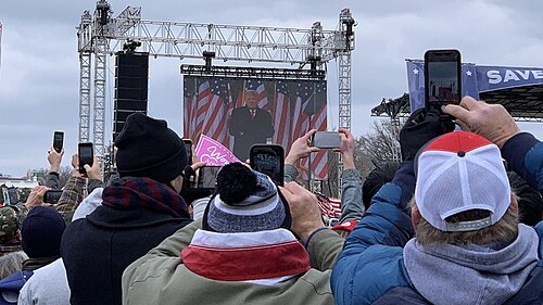 - 12:00: Predsjednik Trump započinje svoj jednosatni govor.[68] Ponavlja lažne navode da su izbori ukradeni, kritizirajući potpredsjednika Pencea poimence nekoliko puta, optužujući kolege republikance da nisu učinili dovoljno da potkrepe svoje lažne navode i navodeći da će s mnoštvom prošetati do Kapitola. povlači se u Bijelu kuću odmah nakon govora.[70]