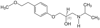 Metoprolol sadrži stereocentar i sastoji se od dva enantiomera. Ovo je racemat, tj. 1: 1 smjesa (R) - i (S) -form:[1]