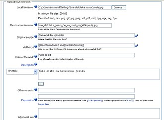 - Ako je slika označena GFDL ili nekom od cc-by licenci, potrebno je na stranicu s opisom slike kopirati povijest datoteke (povijest možete kopirati kao tekst; CommonsHelper sam kopira povijest)