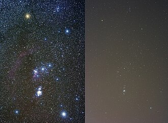 Zviježđe Orion snimljeno noću bez svjetlosnog zagađenja (lijevo) i noću pod svjetlosnim onečišćenjem (desno).