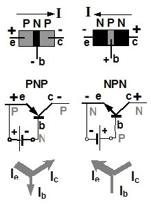 Bilo da se radi o PNP ili NPN tipu tranzistora oba obavljaju istu funkciju. Razlika je u polaritetima vanjskih napona i struja, te u vrsti nosilaca električne struje. U PNP tipu tranzistora glavni su nosioci električne struje šupljine, a u NPN tipu tranzistora su to elektroni.