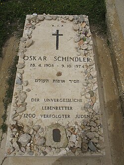 - ↑ Scindlerov grob nalazi se u blizini autobusnog parkirališta pokraj Sionskih vrata. Nausprot parkirališta nalaze se vrata koja vode u groblje. Schindlerov grob smješten je na najnižoj terasi, desno od vrata. GPS lokacija mu je UTM 711223 I, 3517126 S, Zona 36N. Grob se lako prepozna po tome što je jedini grob na kojem je naslagano kamenje, što je uobičajeni znak što ga Židovi ostavljaju prilikom posjeta grobovima svojih najbližih.
