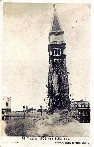 U srpnju 1902. godine sjeverni je zid tornja ozbiljno napukao. Napuklina je sljedećih dana i dalje rasla. Konačno, u ponedjeljak, 14. srpnja oko 9:45, zvonik se totalno urušio, srušivši pritom do temelja i lođu u podnožju. Sreća u nesreći je bila, da nitko nije poginuo, osim mačke koja je u lođi obitavala.[1] Zbog pozicije zvonika, nastala šteta bila je relativno mala. Osim lođe, nastradao je i ugao zgrade Bibliotece Marciane. Veliki mramorni stup zaštitio je zgradu same bazilike svetog Marka.