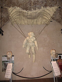 Oko 1615. ili 1616. godine Faust Vrančić je objavio crtež četverokutnog padobrana. Iako za to nema pisanih dokaza, dosad se pogrešno pretpostavljalo da je Faust kao 65-godišnjak, teško bolestan i nedugo prije smrti - s takvim padobranom izveo prvi uspješni skok (ovisno o izvoru) sa zvonika bazilike sv. Marka u Veneciji ↓2 ili s 86 metara visokog zvonika katedrale svetoga Martina u Bratislavi. Međutim, nedavno je temeljem analize izvora znanstveno dokazano (dr. sc. Iva Kurelac) da Vrančić nije sam skokom isprobao svoj padobran. Iva Kurelac je, osim toga, opovrgnula u hrvatskoj znanosti dugo uvriježenu, pogrešnu tezu o tome da je engleski matematičar i biskup John Wilkins (1614.-1672.) u svojem djelu Mathematical Magick (London, editio princeps, 1648.), opisao skok Fausta Vrančića padobranom, izveden sa zvonika crkve sv. Marka u Veneciji.[18]