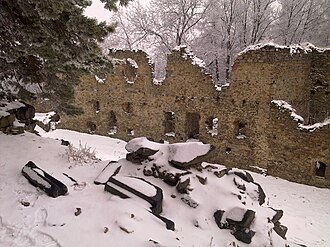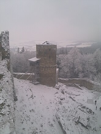 Iz tornja se mogu vidjeti okrugli bedemi, koje je postavio Vlček iz Čenova. Druga vrata se zatvaraju željenim klinom. Cijeli donji dio drugog dvorišta je zatvoren građevinama i ima nepravilan oblik. Treća vrata vode do unutrašnje palače. Dvorište pred zamkom bilo je puno gospodarskih drvenih zgrada. Građevine od cigle su najmlađe na zamku i potječu iz 15 stoljeća. Bazen na lijevoj strani služio je kao rezervoar kišnice ili se voda donosila od ispod zamka. Bio je dubok oko 10 m, ali je postupno zakopan.