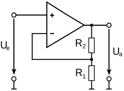 Operacijsko pojačalo u neinvertirajućem spoju (slika desno) ne zakreće fazu ulaznog signala (Ue) te se on na izlazu operacionog pojačala pojavljuje pojačan (Ua) i u istom faznom odnosu s ulaznim signalom. Naponsko pojačanje operacijskog pojačala u neinvertirajućem spoju je prema pojednostavljenom prikazu na slici određeno otporima R2 i R1: