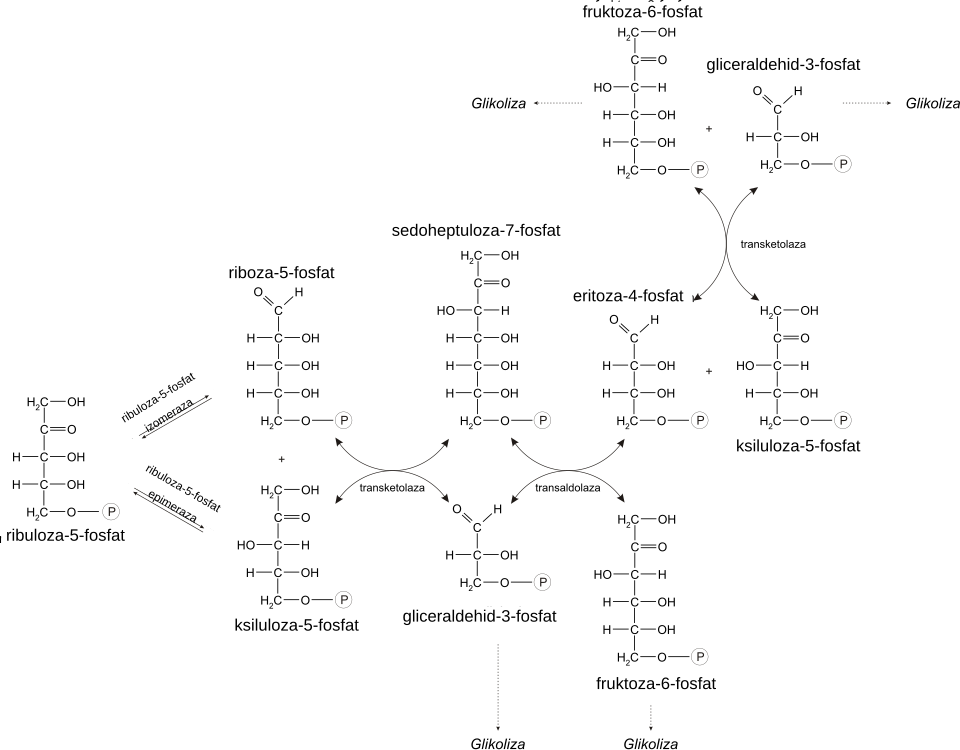 | ksluloza-5-fosfat + eritroza-4-fosfat | → gliceraldehid-3-fosfat + fruktoza-6-fosfat | transketolaza |