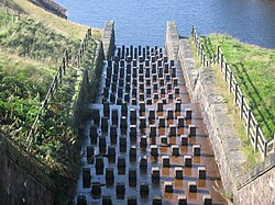- nizvodnog praga – koji može biti gladak ili nazubljen, podiže mlaz na izlazu iz slapišta da bi se postiglo povratno strujanje koje onda ne uzrokuje potkopavanje temelja)