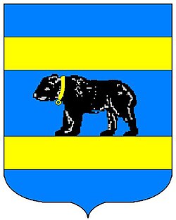 (HR) Na plavom polju dvije vodoravne zlatne grede, između greda crni hodajući medvjed. [1/42] |