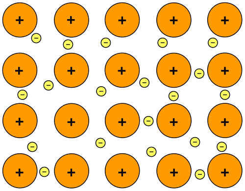 Atomi metala su gusto složeni jer svi imaju jednake polumjere. Zbog blizine atoma preklapaju se vanjske valentne orbitale atoma i nastaju nove zajedničke molekulske orbitale u kojima se vanjski elektroni slobodno gibaju, kažemo da su elektroni delokalizirani. Elektroni ne pripadaju točno nekom određenom atomu nego svima a to znači da su atomi zapravo kationi.