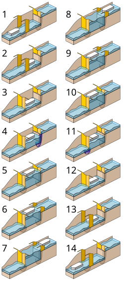 Za punjenje i pražnjenje kroz zidove služi kanal uzduž cijele komore s mnogo bočnih otvora. Na početku punjenja osjeća se mali udar vode, jer više vode dotječe kroz otvore koji su bliži početku kanala. Zbog toga nastaje mali vodeni val koji nije ugodan. Pogodnim razmještajem otvora može se jačina te pojave ublažiti.