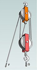 - Arhimedov koloturnik sustav je od n kolotura različitih veličina, od kojih je polovica nepomična i povezana, dok su preostali također međusobno povezani, ali se zajedno pomiču. Sila F koja drži ravnotežu s težinom tereta W iznosi: