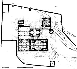 Velika knjižnica (skriptorij) iz 1063. godine ima kvadratičan plan i križne svodove, te deset niša različitih veličina u kojima su spremane knjige. Na jugoistočnom kutu knjižnice nalazi se mala crkva posvećena Sv. Grguru Prosvjetitelju.
