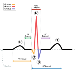 - QRS kompleks predstavlja depolarizaciju i stezanje mišića klijetki srca (QR) i istovremenu polarizaciju pretklijetki (S). Signal putuje Hisovim snopom koji proizlazi iz AV snopa i grana se po lijevoj i desnoj strani septuma, i nadalje svaki snop tvori Purkinjeova vlakna koja putuju duž zida svake klijetke.[2] QRS kompleks obično traje 75-105 ms.[3]