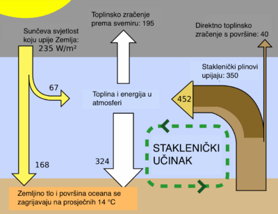 Najveći dio apsorbirane energije Sunčeva zračenja Zemlja pretvara u toplinu. Tako zagrijana Zemljina površina emitira natrag u atmosferu svoje elektromagnetsko zračenje, i to u infracrvenom području spektra (dugovalno zračenje). Valna duljina i jakost (intenzitet) Zemljina dugovalnog zračenja ovise o temperaturi Zemljine površine T0. Energija L0 koju zrači Zemlja iznosi: