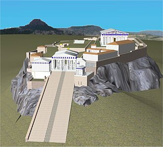 Akropola se nalazi na brežuljku gdje je još u Mikensko doba bio utvrđeni grad. Sve građevine izgrađene na Akropoli su iz ← 5. st., a najočuvaniji su Partenon, Erehteion, hram božice Nike i svečani ulaz. Na Akropolu se pristupalo kroz monumentalni ulaz – Propileje. Arhitekt Mnesikle uspješno je riješio problem na strmom terenu sagradivši široko stepenište između dva zida modificirano kao dorski hram.