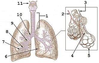 Dušnik, bronhi i bronhioli iznutra su obloženim cilindričnim epitelom koji sadrži trepetljike i vrčastim stanicama koje izlučuju sekret. U većim bronhima cilindrični je epitel višeredan, te se postupno smanjuje do jednoslojnog cilindričnog. Na kraju postaje jednoredan kubičan epitel. Smanjuje se i broj vrčastih stanica. Trepetljike epitela u dišnim putevima svojim kretanjem djeluju tako da pomiču sekret vrčastih stanica prema gore do grkljana gdje ga osoba proguta ili iskašlje. Stijenka u alveolarnim vodovima i alveolama građena je od pločastih stanica (pneumocita tip 1 i tip 2) kroz koje se odvija izmjena plinova. Uz same alveole nalaze se i kapilare plućnog krvotoka u koje dovode ugljikov dioksid koji se otpušta i preuzimaju i odvode kisik ostalim organima. Stijenka bronha sadrži i glatke mišićne stanice i elastične niti. Mišićne stanice svojom kontrakcijom mijenjaju promjer bronha, te tako utječu na protok zraka prilikom faza disanja. Bronhi sadrže i hrskavicu koja kao prsten obavija bronh, dok je bronhioli ne sadrže.