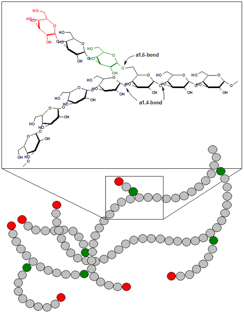 Glikogen je jako razgranati polimer, koje se bolje opisuje kao dendrimer. Najviše jedinica glukoze je povezano α-1,4 glikozidnom vezom, dok je otprilike 1 od 12 jedinica glukoze povezana sa α-1,6 glikozidnom vezom, pri čemu nastaje grananje lanca. Na reducirajućem kraju, molekula glikogena je vezana za protein glikogenin, koji je glikozil transferaza i nalazimo ga kao dimer u središtu granule. Granule glikogena sadrže glikogen i enzime sinteze (glikoneogeneza) i razgradnje (glikogenoliza) glikogena. Enzimi se nalaze između vanjskih grana molekule glikogena i djeluju na nereducirajuće krajeve.