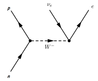 Feynmanov dijagram za beta-minus raspad neutrona u proton, elektron i elektronski antineutrino, putem srednjeg teškog W- bozona.