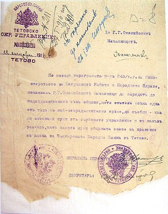 Dokument iz Tetovski okrug sa naredbom do nachanlike. Dokument je iz 22. siječnja 1916. godine, kada Tetovski Okrug se nalazi u Kraljevini Bugarske.
