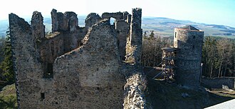 Iz tornja se mogu vidjeti okrugli bedemi, koje je postavio Vlček iz Čenova. Druga vrata se zatvaraju željenim klinom. Cijeli donji dio drugog dvorišta je zatvoren građevinama i ima nepravilan oblik. Treća vrata vode do unutrašnje palače. Dvorište pred zamkom bilo je puno gospodarskih drvenih zgrada. Građevine od cigle su najmlađe na zamku i potječu iz 15 stoljeća. Bazen na lijevoj strani služio je kao rezervoar kišnice ili se voda donosila od ispod zamka. Bio je dubok oko 10 m, ali je postupno zakopan.