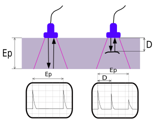 Prije ispitivanja provodi se baždarenje na karakteristične greške, u prvom redu na zadnju stjenku. Usporedbom odjeka od greške (reflektor) i odjeka od zadnje stjenke moguće je dobiti veličinu greške. Za ispitivanje tankih limova i grešaka blizu površine, te neravnina zadnje stijenke, koriste se ultrazvučne glave s dva vibratora: jedan šalje ultrazvučne valove, a drugi ih istovremeno prima. To su SE vibratori. Nisu najpogodniji za određivanje grešaka, ali se koriste za određivanje grešaka i mjerenje debljine stjenke do najmanje 1 mm.