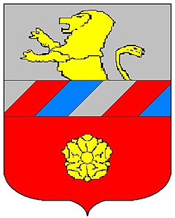 (HR) Vodoravna podjela gredom. Vodoravna greda se sastoji od šest desno kosih greda redom srebrena, crvena, plava, srebrena, crvena, plava. Iznad grede srebreno polje, na polju polovica zlatnog lava, ispod grede na crvenom polju zlatni cvijet (ruža). [1/9] | |