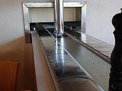 Vrlo zanimljiva, praktična i zabavna primjena pokretne trake vidljiva je u suši (ili sushi) restoranu, gdje se tanjuri sa sušijem (raznolikom sirovom ribom) nalaze na okretnoj pokretnoj traci, koja putuje kroz restoran i prolazi pokraj svakog stola, tj. gosta, brzinom od 8 centimetara u sekundi. Gosti mogu naručiti jelo ili pak jednostavno uzeti što žele od svježe pripremljenog sušija s putujuće pokretne trake. Pokretnu traku za takvu vrstu restorana u Japanu je izumio Yoshiaki Shiraishi 1958., jer je imao problema s osobljem u svojemu malom restoranu i poteškoće pri njegovu samostalnom vođenju.