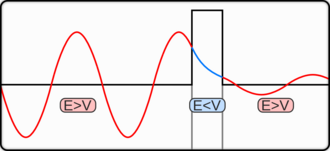 Temeljna razlika između čestica i valova u klasičnoj fizici pokazuje slika da se u valnoj teoriji može poništiti totalna refleksija. Totalna refleksija svjetlosti može se ukloniti tako da iza jedne staklene ploče postavimo u ne prevelikom razmaku drugu staklenu ploču. Tada se i u drugoj staklenoj ploči širi svjetlost, iako se u zraku između staklenih ploča ne primjećuje svjetlost. Kod valova materije toj drugoj postavljenoj ploči stakla odgovara ponovni skok potencijala prema dolje. Poslije ponovnog pada potencijala postaje potencijalna energija ponovno manja od energije. Valna duljina je opet realna, i u tom dijelu prostora ponovo se mogu širiti katodne zrake. Pustimo li katodne zrake da se šire prema takvom potencijalnom brijegu, brzina se sve više umanjuje i konačno postaje ta brzina jednaka nuli. U okolini mjesta, gdje je U = E, katodne se zrake bitnim dijelom reflektiraju. No po zakonima valnog širenja još uvijek jedan dio amplitude vala prodire i u potencijalni brijeg gdje je valna duljina imaginarna. Do mjesta x1 u brijegu, gdje valna duljina ponovo postaje realna, umanjila se ta amplituda na izvjesnu malu, ali ipak od nule različitu vrijednost. Od mjesta x1 nadesno ta mala amplituda ostaje konstantom i titra poput amplitude ravnog vala. Dakle, iza potencijalnog brijega širi se ponovo val materije, pojavljuju se opet katodne zrake. Te katodne zrake šire se iza potencijalnog brijega s prvobitnom brzinom, no s mnogo manjom jačinom (intenzitetom). Pojavljivanje katodnih zraka iza potencijalnog brijega samo je tada znatno ako potencijalni brijeg nije ni jako visok ni jako širok. Valovi materije prodiru otprilike za svoju valnu duljinu u brijeg potencijala.