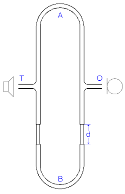 Da se dva tona iste frekvencije mogu interferencijom poništiti, pokazao je njemački fizičar Georg Hermann Quincke. Savijena cijev (Quinckeova cijev) sastoji se od dva dijela koja se mogu uvlačiti jedan u drugi. Ako se kod T proizvede ton pomoću glazbene viljuške, a na izlazu O drži uho, ton će biti pojačan ako su putovi zvučnog vala kroz dio A i B isti. Izvučemo li jednu cijev, putovi zvučnih valova kroz oba kraka bit će različit, pa će ovisiti o razlici faze obaju valova da li će ton na izlazu biti više ili manje oslabljen. Ako je fazna razlika obaju valova kroz krakove A i B jednaka λ/4 (λ - valna duljina zvučnog vala), oni će se poništiti, pa na izlazu cijevi nećemo čuti nikakav ton.