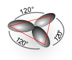- AX3 (npr. BCl3): sp2 hibridizacija; trigonalni planarni oblik; kutovi između veza su 120°