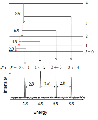 Rotacijski spektri molekula dani su nizom linija koje imaju među sobom jednaki razmak. Razmak između spektralnih linija iznosi: