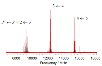 Već prema ta 3 slučaja dobivamo tri grupe frekvencija koje ovise kvadratično o kvantnom broju l. Na slici vide se tri grane. Kao apscisa nanesena je frekvencija, a kao ordinata l. U tom dijagramu pojavljuje se tri grane kao tri parabole. Iz grafičkog prikaza može se odmah razabrati spektar. Linije se zgušćuju prema kraju. Ovo zgušćivanje, koje je tipično za sve vrpce u vidljivom dijelu spektra, izazvano je promjenom momenta tromosti molekule.
