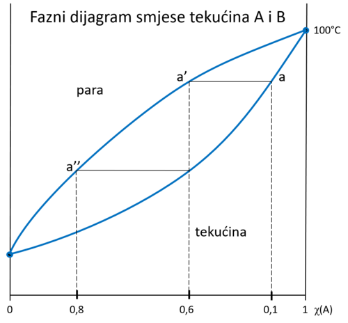 Ako na os x nanesemo vrijednosti sastava smjese a na os y nanesemo vrijednosti temperature na kojima smjesa vrije imamo fazni dijagram tekuće/plinovito. Krivulja povezuje temperaturu vrelišta sastojka A s temperaturom vrelišta sastojka B, tako da krivulja najčešće nije ravna crta već je „obješena“. Dijagramu možemo dodati još i krivulju koja prikazuje sastav para smjese u ovisnosti o sastavu smjese. Krivulja također povezuje temperaturu vrelišta sastojka A s temperaturom vrelišta sastojka B i nije ravna crta već je „izdignuta“. Dijagram sada zorno pokazuje tijek destilacije.